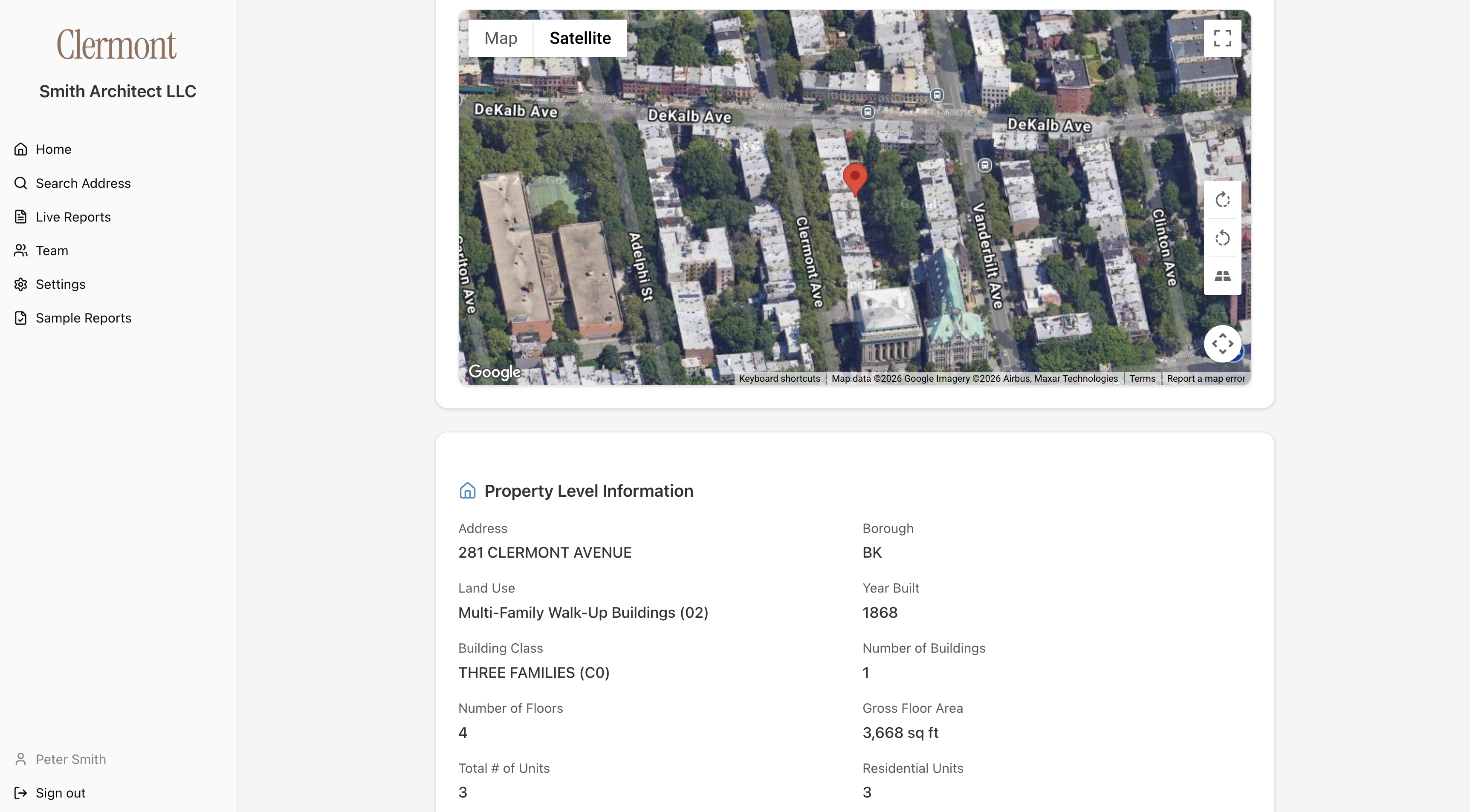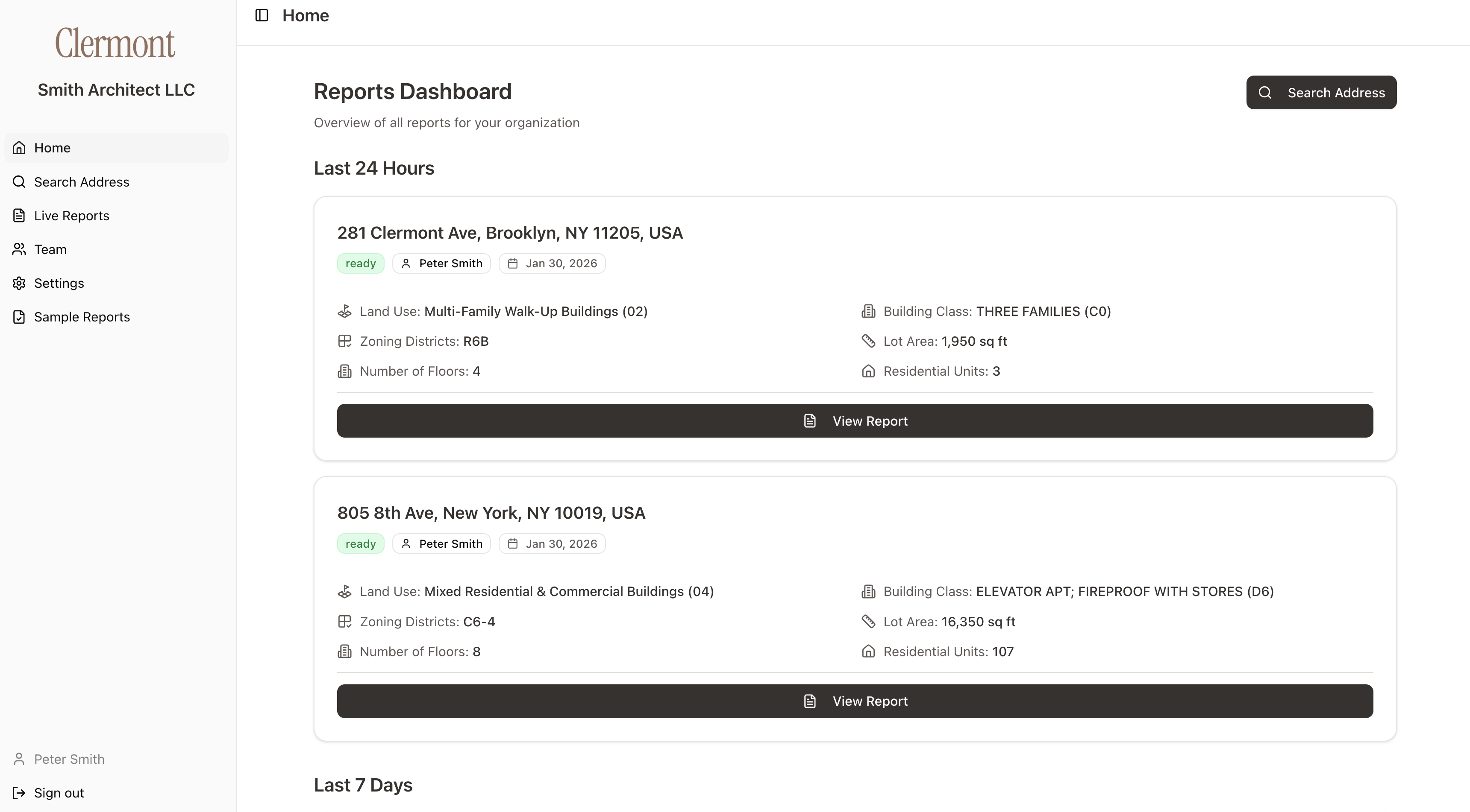 Getting started is simple. Create an account and log in, then you can search for different property addresses and generate zoning reports instantly. You can also connect Clermont to your client intake flow, letting you organize multiple projects or clients. For each address you enter, Clermont will generate a zoning snapshot you can reference during your client conversations.