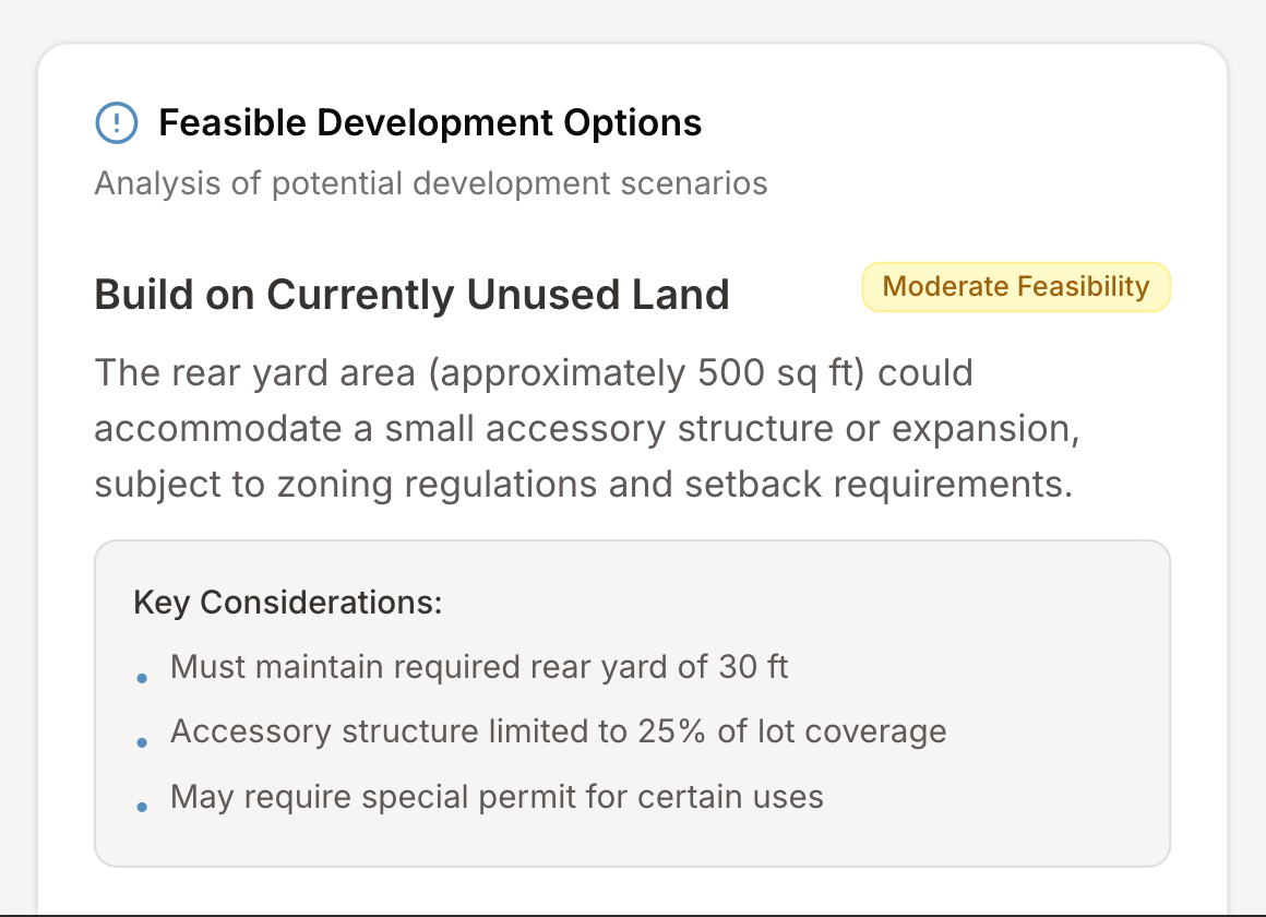 Clermont centralizes parcel data and zoning interpretation into a single, repeatable workflow. Instead of manually pulling data from multiple tools and interpreting it each time, Clermont provides a structured feasibility summary tied directly to a specific property and client.